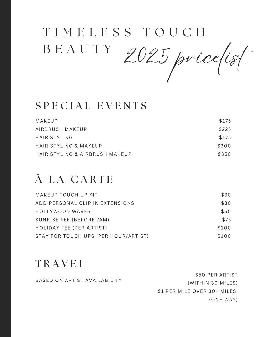At Timeless Touch Beauty, we specialize in providing high-quality hair and makeup applications that enhance your natural beauty. As a mobile beauty team of skilled hairstylists and makeup artists, we collaborate to deliver personalized, polished looks tailored to your unique style.